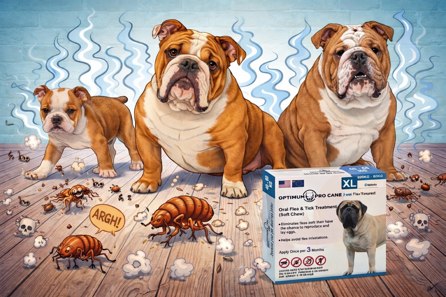 Oral flea and tick treatment (soft chew) for dogs. Eliminates fleas before they can reproduce and lay eggs; helps avoid infestations. Apply once per 3 months. Beef flavored — 3 tablets per pack. For dogs and puppies 8 weeks of age or older. This pack is size XL for dogs 40–60 kg.