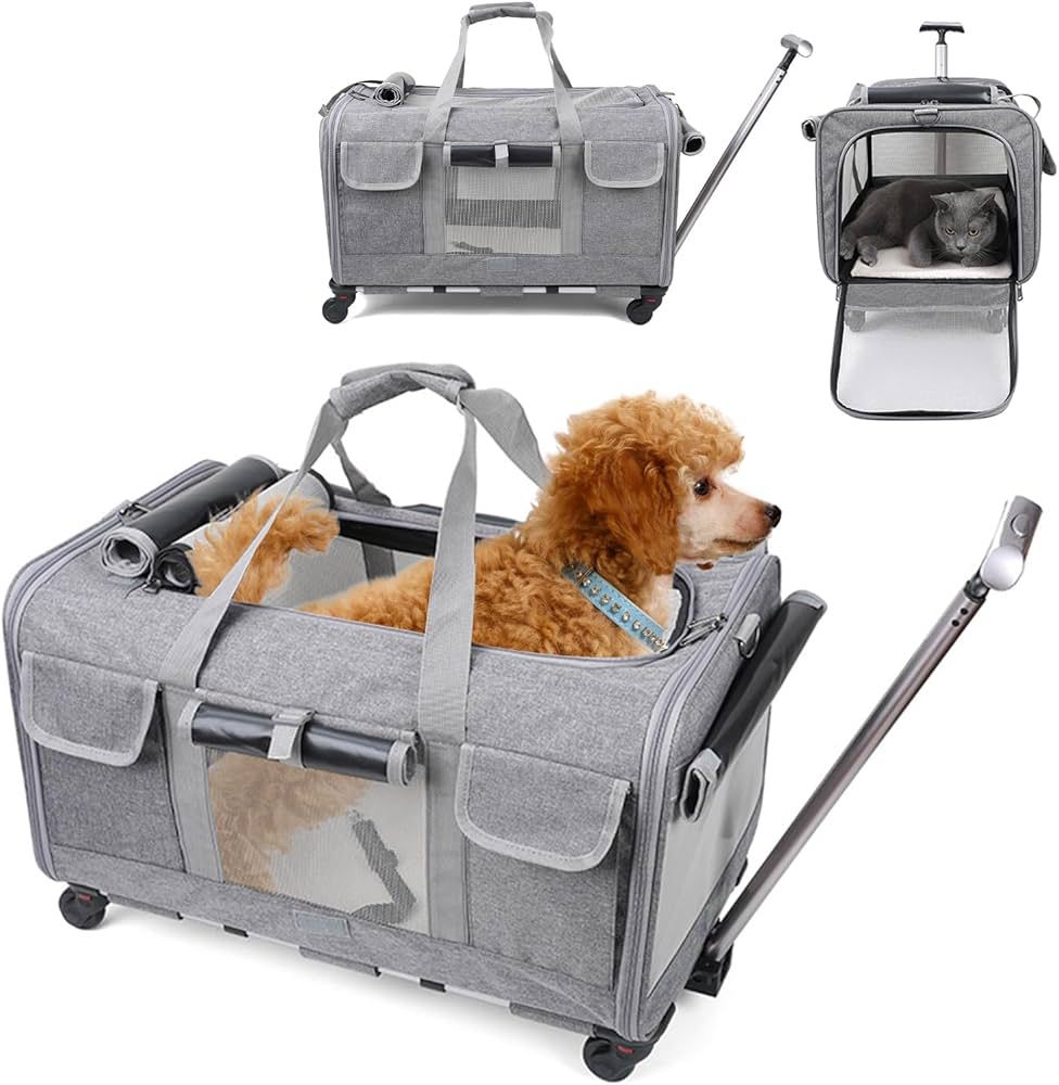 Convenient travel trolley carrier for pets. Features wheels and a telescopic handle.